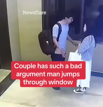 The video begins with what seems like a tense but ordinary disagreement between a man carrying a backpack and his partner. The woman appears to be gesturing in frustration, while the man leans closer, visibly upset. In a matter of seconds, the tension escalates to a breaking point. Without warning, he bolts toward a nearby window and hurls himself through it, leaving the woman in utter shock and horror.