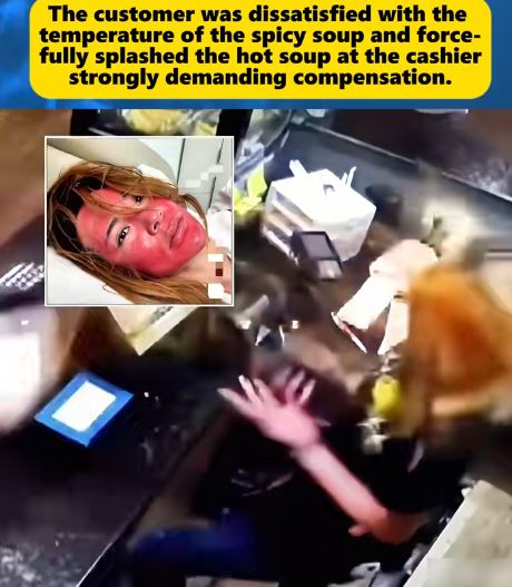 In a disturbing incident caught on surveillance footage, a customer’s frustration over a bowl of soup escalated into shocking violence. According to reports, the woman became dissatisfied with the temperature of her spicy soup and, instead of calmly addressing the issue, forcefully threw the steaming liquid directly into the cashier’s face.