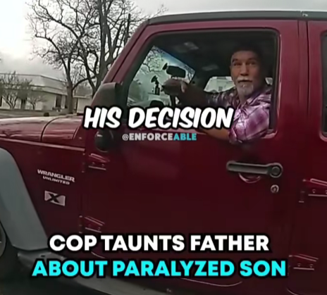 The clip begins with the father, seated in his red Jeep, engaging in a tense back-and-forth with the officer during a traffic stop. The man’s frustration is evident as he raises concerns about being treated unfairly. But what sent shockwaves through viewers was the moment the officer reportedly referenced the father’s paralyzed son in a mocking tone.