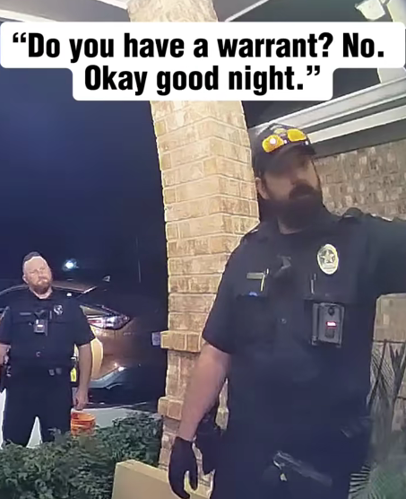 Without raising his voice, the person behind the camera simply asks, “Do you have a warrant?” When the officer responds “No,” the homeowner wastes no time ending the interaction: “Okay, good night.” The door closes, and the video cuts off — but that brief moment has sparked a wave of online debate about privacy rights, police authority, and citizens’ understanding of the law.
