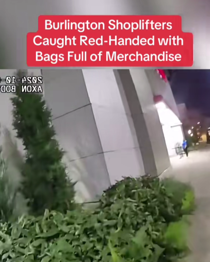 “Stop right there! Police!” one officer shouts as the suspects hesitate for a brief moment before attempting to walk faster. Within seconds, the officers close the distance and detain them without further incident. “You’ve got a lot of Burlington merchandise in there,” an officer remarks while opening one of the bags. Inside, they find brand-new clothes, shoes, and accessories, many still with security tags attached.