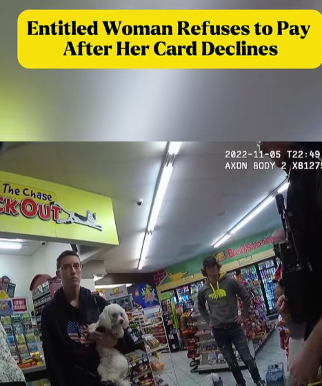 A now-viral bodycam video shows a tense standoff at a convenience store after a woman refused to pay for her items when her card was declined — leading to police being called and an embarrassing public spectacle.