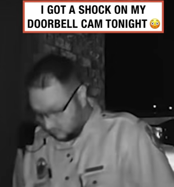 The clip, recorded in crisp black and white, shows a uniformed man appearing at the front door late at night. His demeanor seems calm at first — head slightly bowed, flashlight in hand, the way an officer might approach a home during a routine call. But as the seconds tick by, something about the moment feels off. The man doesn’t knock. He doesn’t speak. He just stands there.