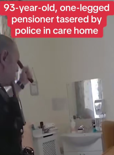 A shocking incident inside a quiet care home has sparked nationwide outrage after bodycam footage revealed officers tasering a 93-year-old, one-legged pensioner during an attempted intervention. The video, which has now circulated across major platforms, shows the frail man in his wheelchair moments before officers deploy a stun device — a decision that has left the public furious and demanding justice.