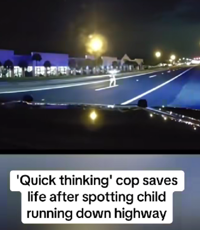 The officer’s reaction was instantaneous. Without hesitation, he slowed down, flipped on his emergency lights, and positioned the patrol vehicle diagonally across the lanes to block oncoming traffic. In the next moment, he jumped out of his car and sprinted toward the child. As cars slowed and headlights illuminated the scene, the officer reached the child and safely carried them off the road.