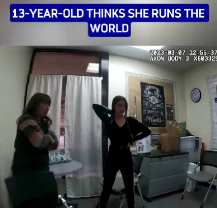 The footage, now circulating widely on social media, shows the young girl standing with her hands on her hips as officers enter the office. One officer gently but firmly says, “You’re not in charge here, okay? Let’s take a breath.” The teen responds with attitude, rolling her eyes and saying, “You don’t scare me.”
