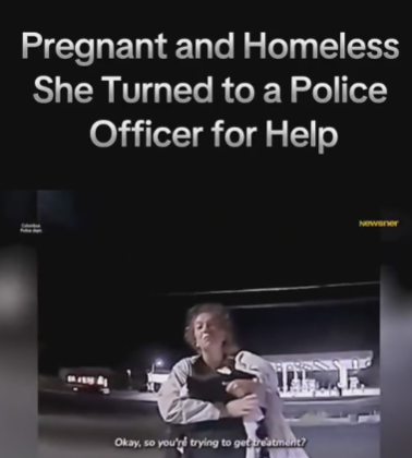 The viral footage, captured on a body camera, shows a woman standing outside a dimly lit gas station, clutching her belly and shivering in the cold. She explains to the officer that she’s pregnant, has nowhere to go, and is trying to find help to get treatment and stability before her baby arrives. Her voice trembles as she admits she’s been sleeping on the streets for weeks, surviving on little more than hope.
