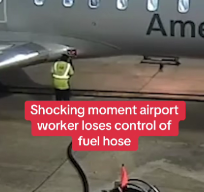 The video, which quickly went viral after surfacing online, begins with the worker performing a routine fuel connection under the aircraft’s wing. Suddenly, the hose appears to dislodge, spraying fuel and thrashing violently like a live wire. Within seconds, the worker jumps back while another crew member rushes in to assist. For several tense moments, the hose continues to lash uncontrollably before being shut off from the main valve.