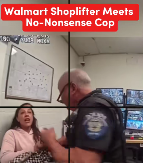 A tense confrontation inside a Walmart security room has taken the internet by storm, showing what happens when a shoplifting attempt meets a cop who doesn’t play games. The viral video begins with a visibly nervous woman sitting against the wall, as an officer firmly questions her about items allegedly stolen from the store. The setting is unmistakable — surveillance screens behind the officer show multiple camera angles of the retail floor, capturing the moment the situation unfolded.