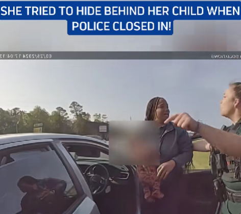 According to police reports, the incident began after officers pulled the woman over for multiple outstanding warrants. What was expected to be a standard traffic stop quickly escalated when she refused to exit the vehicle. As officers surrounded the car, the woman can be seen in the footage stepping out while holding her small child — then positioning the child between herself and the approaching officers.