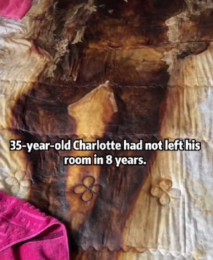The most disturbing part of the discovery was the condition of the room itself. Photos from the scene showed a decayed mattress, damaged flooring, and walls stained from years of neglect. Investigators believe Charlotte spent nearly all her time in bed, surrounded by clutter and debris.