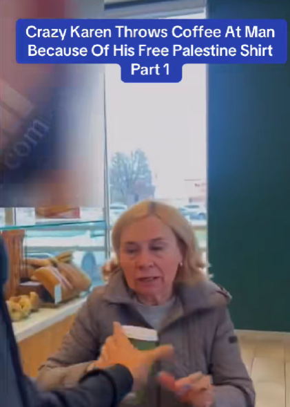 A heated encounter at a café turned into chaos when a woman, now dubbed “Crazy Karen” online, threw her coffee at a man after getting into an argument about his ‘Free Palestine’ T-shirt. The shocking moment was caught on video and has since gone viral, sparking heated discussions across social media about tolerance, free speech, and public behavior.