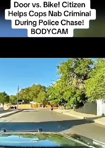 The footage shows the suspect pedaling furiously down a residential street, with police close behind. Out of nowhere, a parked driver, watching the chase unfold, notices the biker heading straight toward him. Without hesitation, he opens his car door at just the right moment — not to harm, but to block the suspect’s path. The timing is perfect. The bike collides with the door, and the suspect tumbles to the ground as officers rush in to make the arrest.
