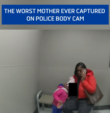 According to reports, the woman had been brought in for questioning following a minor traffic violation that escalated when officers noticed concerning behavior in her vehicle. Bodycam footage shows the woman inside a small waiting room, talking loudly on her phone while holding her crying toddler — completely ignoring the child’s distress.