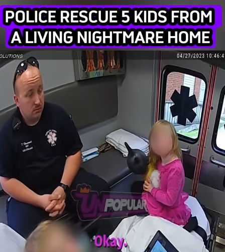 According to the official report, the home was filled with trash, rotting food, and animal waste, with no running water and barely any working lights. Officers immediately called for emergency medical responders to assess the children’s health. The scene inside the ambulance — captured on camera — showed the kids clutching stuffed animals while being comforted by paramedics, their expressions a mix of confusion and exhaustion.