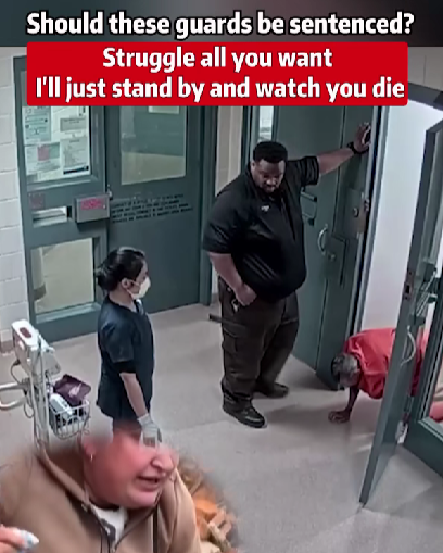 The surveillance video shows the inmate struggling on the ground, clearly in distress, while two guards and a medical staff member appear to watch without taking immediate action. Moments later, the inmate becomes unresponsive, yet no life-saving measures are visibly performed until it’s far too late.