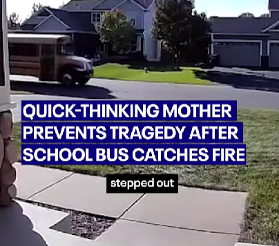 Doorbell footage from the neighborhood shows the mother stepping out of her front yard, sprinting toward the smoking bus, and yelling for the driver to open the door. When the door jammed, she helped force it open while shouting for the children to hurry out. One by one, they escaped, some crying, others frozen in fear — but all safe thanks to her bravery.