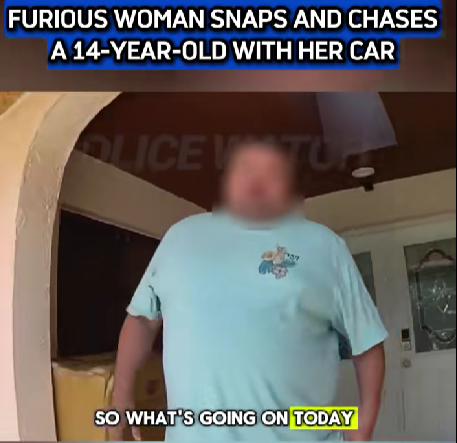 According to the police report, the confrontation began when the teenager was riding his bicycle near a residential street. The woman, described by witnesses as “furious and shouting,” believed the boy had damaged her property — a claim that later turned out to be untrue. Instead of calling authorities, she reportedly got into her vehicle and began following the teen at high speed, yelling at him through the window.