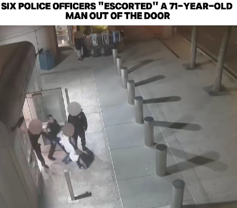 Video footage released online shows Mr. Reynolds standing near the entrance, appearing agitated but not aggressive. Within moments, several officers surround him. The situation quickly intensifies as one officer grabs his arm, and others move in, eventually dragging the elderly man through the doorway and out onto the sidewalk.