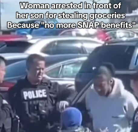 A heartbreaking scene unfolded in a crowded supermarket parking lot when a mother was arrested in front of her young son for allegedly stealing groceries after saying her SNAP benefits had run out. The emotional footage, captured by a bystander, has since gone viral — sparking nationwide debate over poverty, desperation, and compassion.