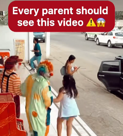 The footage shows what looks like a cheerful day outside a local shop. A mother, holding her phone and a small bag, walks toward her car with her young daughter right behind her. Two clowns β seemingly hired to entertain nearby β are laughing and greeting passersby. But in a blink, what appears to be a playful moment takes a shocking turn.