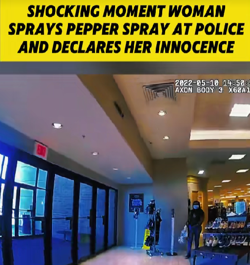 According to the video, the woman had been acting strangely inside the building moments before the confrontation. She walked near the front entrance, pacing back and forth as officers approached her calmly, asking simple questions. But instead of cooperating, she reached into her bag and pulled out a small canister — unleashing a cloud of pepper spray directly toward the officers.