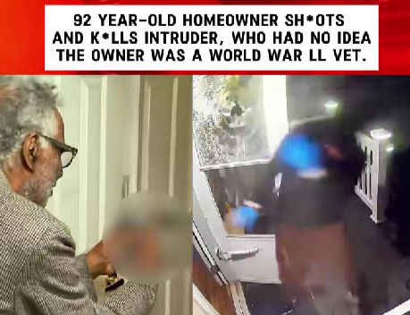 According to early reports, the elderly man—later identified as a World War II veteran—was at home when an intruder reportedly attempted to break in during the night. Surveillance footage from outside the home shows a person approaching the door before forcing their way inside. Inside footage shows the elderly homeowner reacting quickly, despite his age, after hearing the disturbance. Authorities say he feared for his life and responded in a way many seniors hope they never have to.