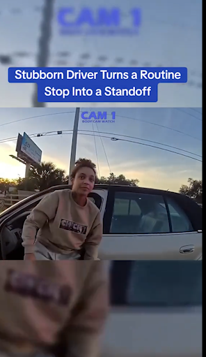 A body-camera still making the rounds online is drawing massive attention after what appeared to be a routine traffic stop spiraled into a tense and unpredictable situation. Labeled “CAM 1” with a bold headline claiming a “stubborn driver” turned the stop into a standoff, the image has viewers divided—and glued to their screens.