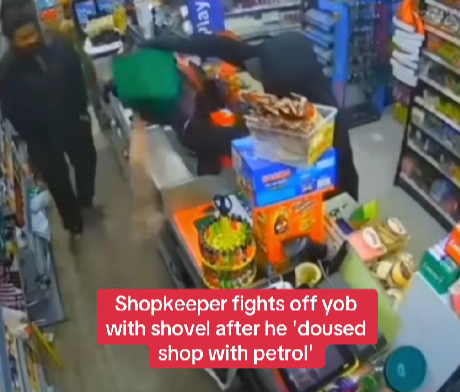 Instead of running or freezing, he grabbed a sh*vel kept behind the counter and confronted the suspect head-on. The footage shows a chaotic struggle as the shopkeeper swings the sh*vel, forcing the yob to retreat and breaking his momentum. Nearby items are knocked over as the suspect stumbles backward, clearly caught off guard by the resistance.