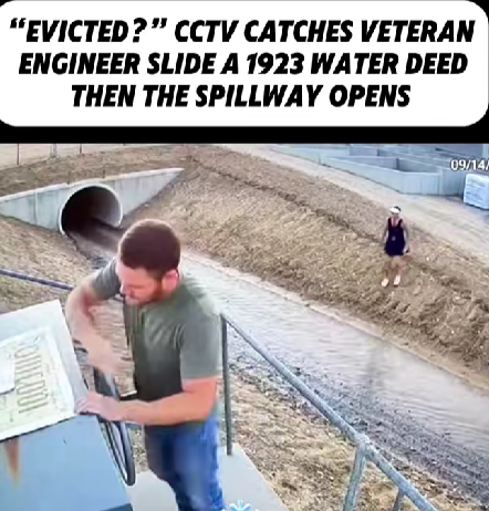 After the document is placed, the spillway gates open, sending water rushing through the channel. The timing is striking. Viewers immediately began speculating about whether the man’s actions triggered the release or whether the opening was scheduled independently. The caption accompanying the footage hinted at a deeper backstory, using the word “evicted?”—a single word that fueled countless theories.