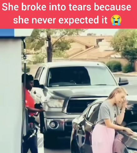 Details shared online suggest that a stranger nearby noticed her and decided to do something unexpected. Whether it was covering her gas, offering help, or surprising her with a simple act of generosity, the gesture caught her completely off guard. The woman’s reaction was immediate and raw. She covered her face, leaned against her car, and broke down in tears.