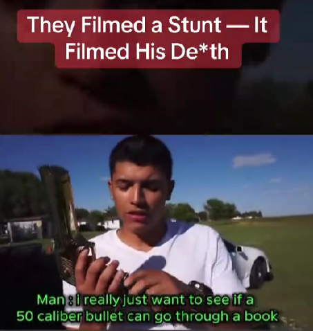 The footage, now widely shared online, shows a young man preparing for what he believed would be a controlled stunt. According to captions and audio circulating with the video, the goal was to test whether a powerful object could pass through a book — an idea inspired by curiosity and the desire to capture something dramatic on camera.