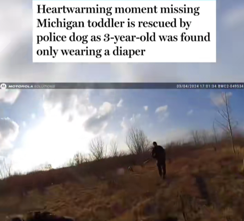 In Michigan, a desperate search for a missing 3-year-old toddler took a miraculous turn when a highly trained police dog tracked the child through thick woods and tall grass.